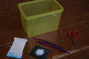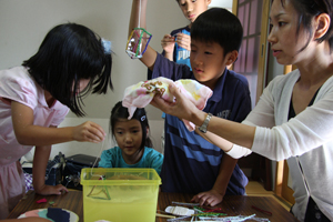 シャボン液を上手に作ってね。お水に石鹸を溶かすだけでOKだけど、一滴だけ液体のりを入れたり、液をぬるま湯にすると粘りのあるシャボン液ができるよ。少し粘りがある方が形は作りやすいんだ。