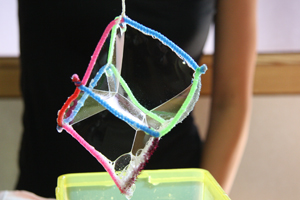 引き上げると、モールの形にそって、シャボンまくが張るんだ。まくがうまくはれると、モールの枠の中心に、正四面体(ピラミット型)なら三角が、正六面体(さいころ型)なら四角が現れるよ。