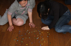 おはじきをばらまきます(おはじきが重ならないよう上手にまいてね)