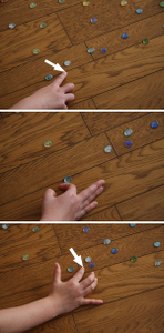 3. ねらったおはじきと、手玉おはじきの間を、指で通します。