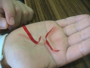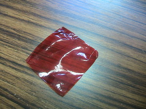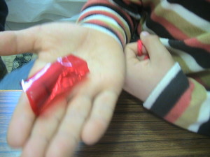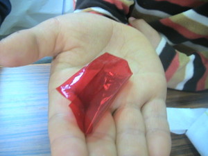 1、たねもしかけもありません♪手のひらに適当な大きさに切ったセロファンをのせます。