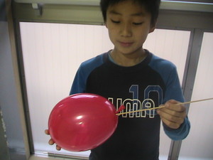 ゴム風船の口と頭の部分は、ゴムがあまりつっぱっていません。尖ったものを刺すと、串が穴をふさいで、ゴムが内側に入って栓をしてくれるのです。だから空気も外にもれないのですよ。
