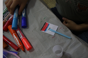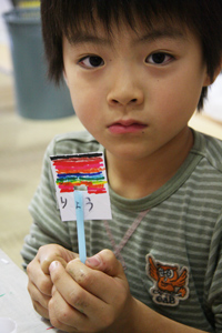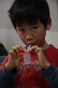 - ふたをとったフィルムケースを、この厚紙でふたするように持って、ストローを吹くと音が出ます。