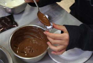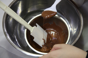 チョコのおいしさはいろんな成分が混じって、ふわっと溶ける食感があること。だから作ってるときは、水が入らないように気をつけて。固くなりすぎたり、水と油が分離して、あのとろける感じがなくなっちゃうんだ。