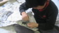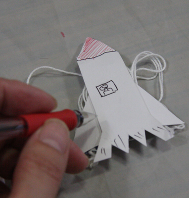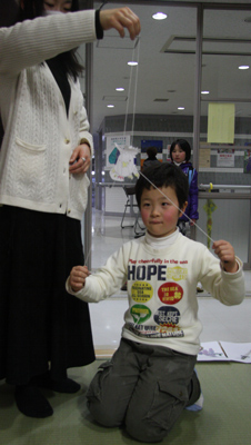 ヒモの真ん中を持って上に持ち上げ、人形を下にして、ヒモの両端を交互に引っ張ります。するすると人形は上に上る・・・ハズなんだけど。安定性が悪かったら、ストローをもう一つつけたり、ヒモの上端に割りばしをつけて、斜めに振れるように工夫してみて。Ninngyoura