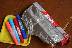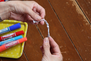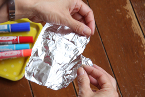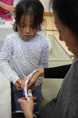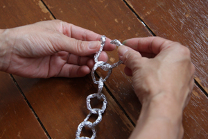 アルミホイルでチェーン 工作 2009.04.192020.10.15 アルミホイルは手近で安くて形を作りやすい素材です。これでチェーンを作りましょう。棒状に丸めたホイルをわっかの形にしてつないでいくだけ。マジックであらかじめ色を塗っておくと、カラフルチェーンになるよ。 ■用意するもの アルミホイル マジック ■やってみよう♪ ホイルを5センチぐらいの長さに切ります。 棒状に丸めます。 輪の形にします。 次のホイルの棒を用意して、3の輪にくぐらせて新たな輪にします。 これを続けて作っていきます。 これがたくさんつながるとチェーンになります。 時々色つきの輪が入ると、なんだかとてもキラキラしてきれい。おともだちが増えそうなこの時期に重宝しそう。お誕生日の飾り付けにも使えるね。