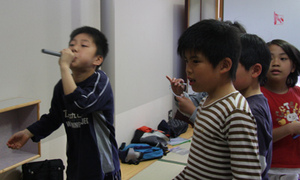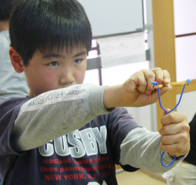玉の大きさや形、ゴムの張り方、筒の持ち方。小さな工夫が名人を生みます。それにしても、得点のゲームにした途端、みんな真剣!がんばれ名人たち。