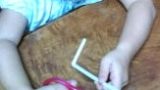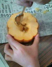 3、かぼちゃの中味をスプーンでくり抜きます。